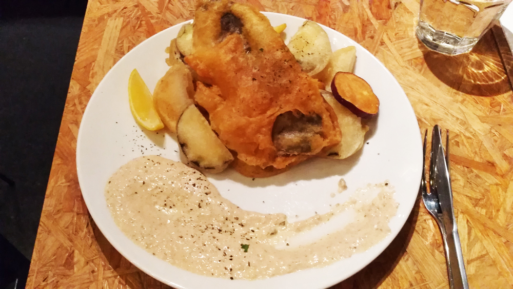 料理はパブらしくフィッシュアンドチップスを頂きました。魚は2種類から選べ、チップスにはさつま芋と山芋もあり飽きることなくいただけました。
