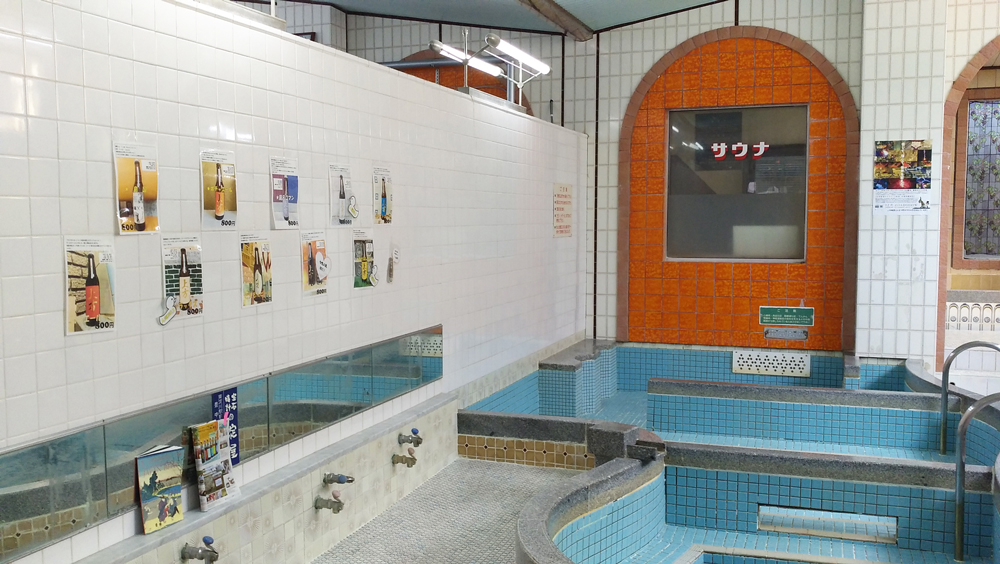 お湯は入っていませんが湯船に入りながらビールを飲むことができ、またビールのグラスが銭湯ならではの「牛乳びんグラス」となっており、腰に手を当ててグイっと一気に飲みたくなるほど、銭湯銭湯したパブです。